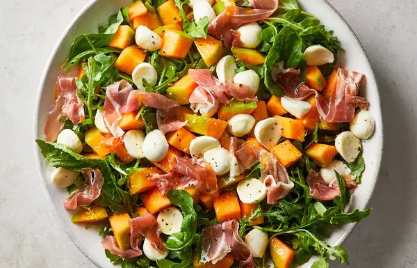 - Place the arugula and basil in a large bowl or on a large platter. Season with salt and pepper, then drizzle with 1 tablespoon oil. Squeeze the lemon over. Toss gently with your hands until coated. Place the melon, mozzarella and prosciutto on top. Season with salt and pepper and drizzle with the remaining 1 tablespoon oil. Taste. If the salad is too sharp, add another drop of oil. If the salad is dull, add a sprinkle of salt. Serve right away.